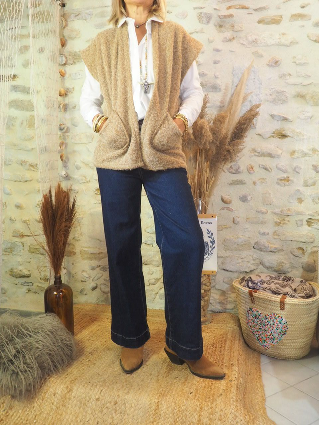 Le gilet BOGOTA est la pièce parfaite pour rehausser vos tenues avec une touche de douceur et de style. Sans manches et entièrement réalisé en bouclette beige, il se prête idéalement au jeu des superpositions, tout en affirmant une allure tendance et chaleureuse.