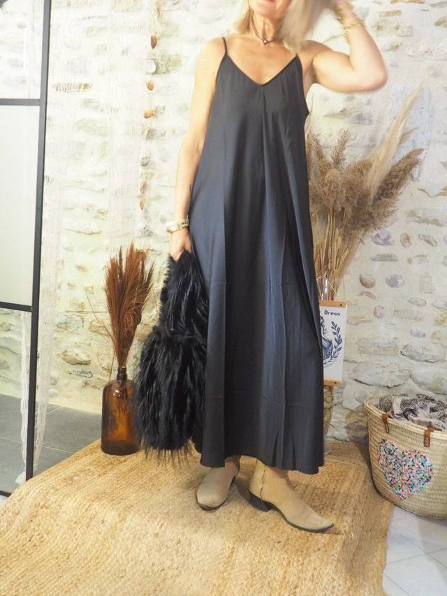 La robe DUBAI est une pièce raffinée qui incarne le chic absolu. Confectionnée dans un satin noir de qualité supérieure, elle séduit par son tombé fluide, sa brillance subtile et sa coupe longue et ample. Pensée en taille unique, elle s’adapte avec aisance à toutes les silhouettes et se prête aussi bien aux superpositions cosy qu’aux tenues de fête sophistiquées.